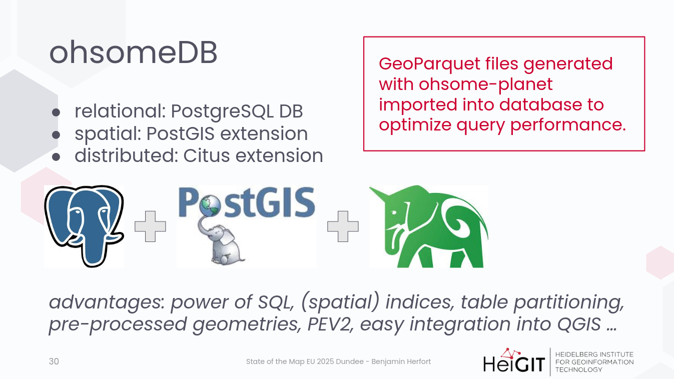 L’équipe de HeiGIT (centre de recherche universitaire d’Heidelberg) nous présente sa feuille de route pour OhsomeDB, leur moteur d’analyse historique de données OpenStreetMap. Au programme : plus de performance, une mise à jour quotidienne, et des fichiers d’échanges plus facilement utilisables dans des outils tiers. À retrouver en avril 2026, et ça devrait faire l’objet d’une présentation au State of the Map Monde à Paris l’année prochaine. Les slides sont disponibles en ligne.