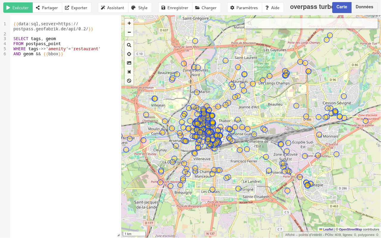 De nombreuses personnes connaissent l’incontournable Overpass Turbo (et Overpass API, le côté serveur). Ces outils permettent d’extraire des données OSM sur une zone particulière, ou selon une combinaison d’attributs. C’est un système extrèmement puissant et complet, mais au prix d’un langage d’interrogation (Overpass QL) un peu abrupte.